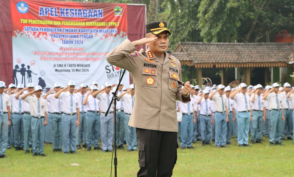 Magelang Jateng,(13/5) Swara Bhayangkara.com – Kapolresta Magelang Polda Jawa Tengah Kombes Pol Mustofa, S.I.K., M.H. memimpin Gelar Apel Kesiagaan Tim Pencegahan dan Penanganan Kekerasan (TPPK) di lingkungan satuan pendidikan. Apel dilaksanakan di Lapangan Upacara SMA Negeri 1 Kota Mungkid, Senin (13/05) pagi.