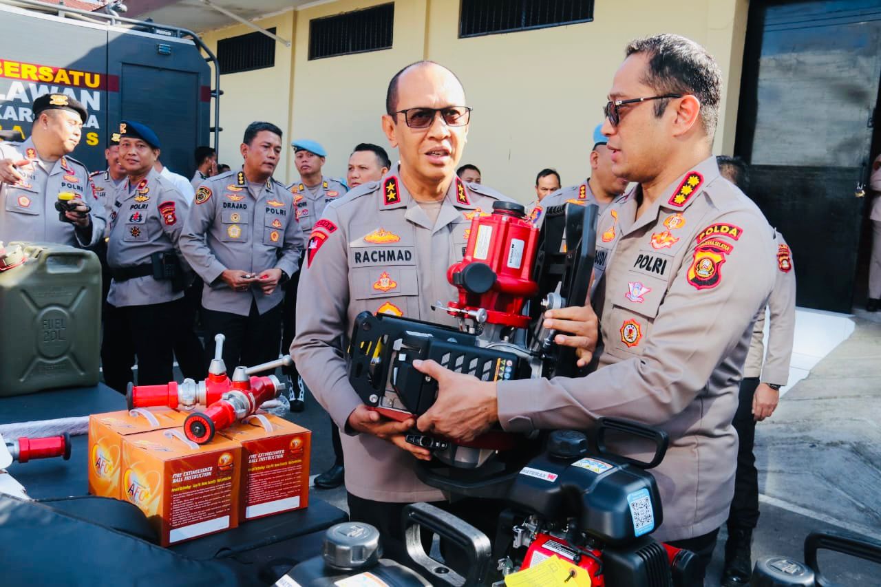 Didampingi Wakapolda Brigjen M Zulkarnaen dan beberapa pejabat utama Polda, terlihat Kapolda memeriksa satu persatu peralatan pemadam api seperti 2 unit Watson Pump Kit MK-3 WTS, 3 unit Mini Sticker Pump MSTR-P GXH 50, 3 unit Suction House MK-150-8, 3 unit Foot Valve and Strainer KOC- BS1561, 3 unit Nozzle Combination UNI -1575 MI, 3 unit Hose Key B-2066, 3 unit Female FA-4 Qc, 10 unit Waterax Hose Weeping EX-187-IWP, 3 unit Wye Gated Connector, 2 unit Fuel Air Transport Tank With Qc FA-552Q, 2 unit Fuel Line12-401 B-NSC, 2 unit Nozzle Combination UNI-1575 MI, 2 unit Foot Valve and Strainer B-5258