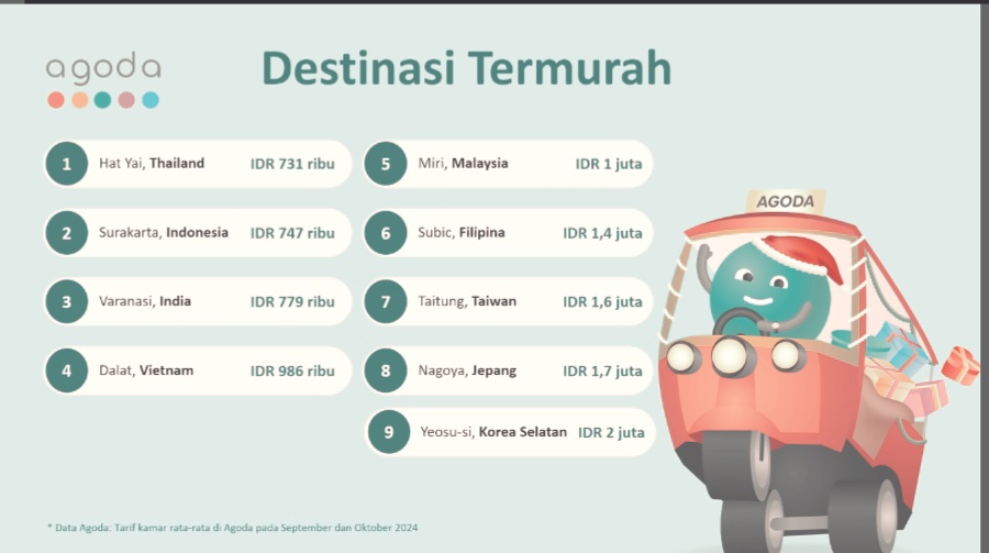Selain Surakarta, Agoda juga mengungkapkan beberapa destinasi dengan tarif terjangkau lainnya, seperti: