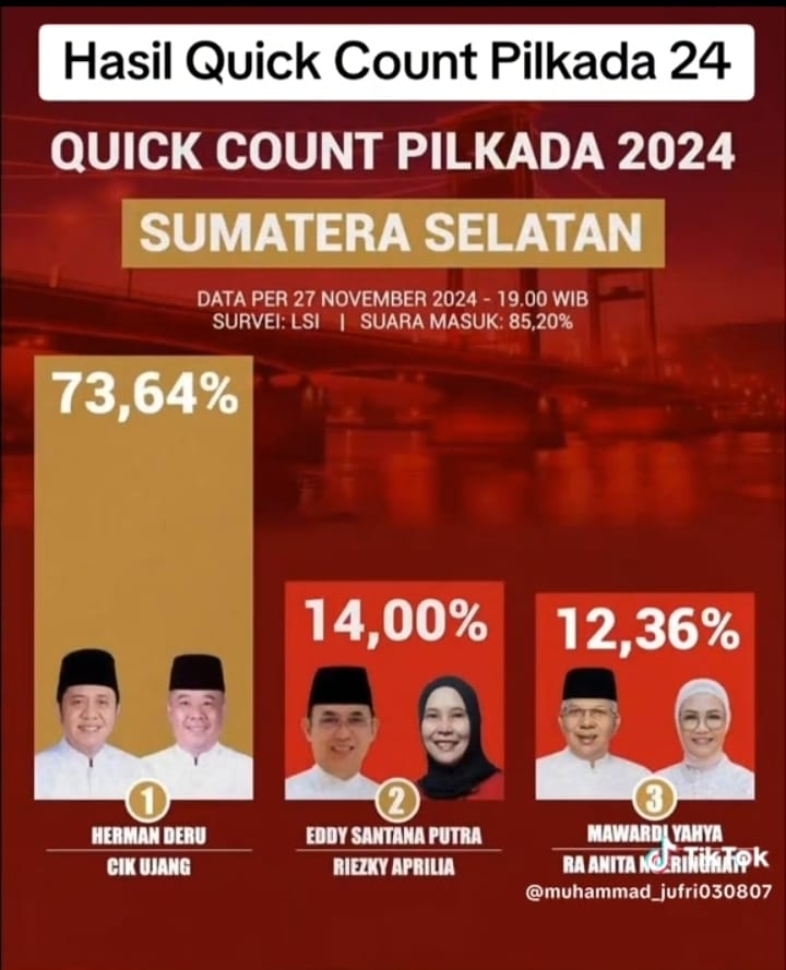 Tentu dengan hasil Quick Count ini menjadi sebuah pandangan bahwa warga masyarakat Sumatra Selatan masih percaya kepada Herman Deru untuk kembali memimpin Sumsel di periode 2025-2030.