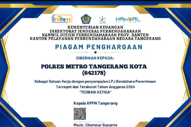 Tangerang, 29/4 (MSB) – Polres Metro Tangerang Kota, Banten, meraih penghargaan dalam bidang pengelolaan keuangan dari Kantor Pelayanan Perbendaharaan Negara (KPPN) Tipe A1 Tangerang.