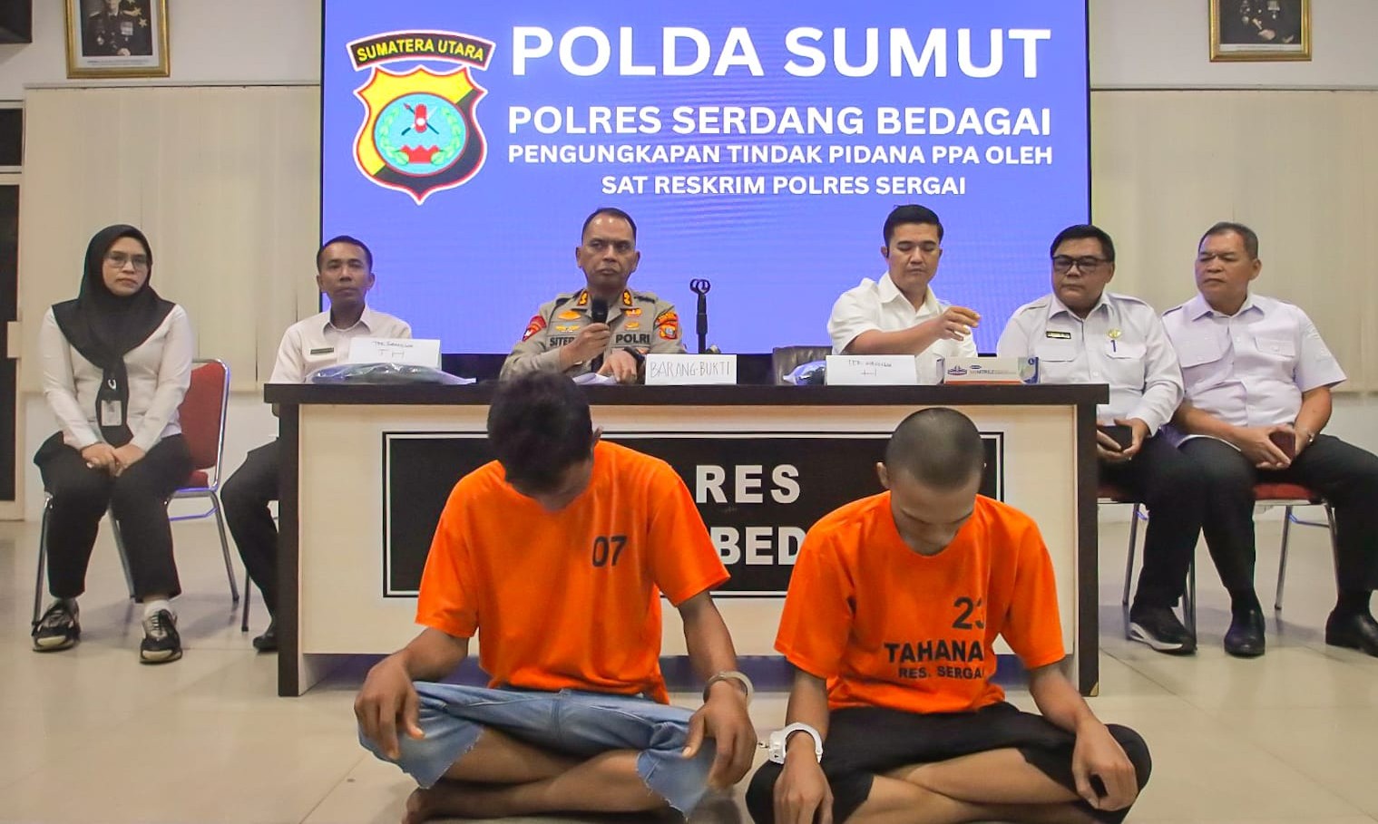 Sergai, 14/08 – Polres Serdang Bedagai (Sergai) menggelar konferensi pers di Aula Patriatama, Rabu (13/8/2025), untuk mengungkap dua kasus tindak pidana persetubuhan dan perbuatan cabul terhadap anak. Kapolres Sergai AKBP Jhon Sitepu, SIK, MH, memimpin langsung rilis tersebut, didampingi Kasat Reskrim Iptu Binrod Situngkir, SH, MH, serta sejumlah pejabat terkait dari Pemkab Sergai.