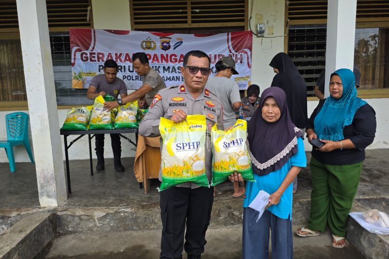 Simpang Empat, 04/9 – Kepolisian Resor (Polres) Pasaman Barat, Sumatera Barat menyalurkan satu ton beras murah kepada masyarakat di Kantor Kelompok Petani Sawit (KPS) Indah Plasma tiga jorong bukit nilam Nagari Lembah Binuang Aua Kuniang, Kecamatan Pasaman, Kamis.
