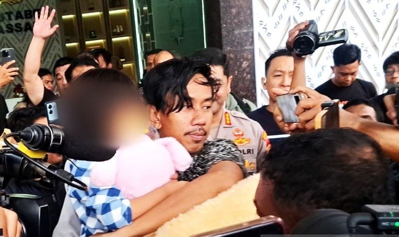 Makassar, 09/11 – Ayah anak korban Dwi Nurmas tidak dapat menahan rasa senang bercampur haru saat melihat anaknya Bilqis yang berusia 4 tahun tiba dengan selamat dari Provinsi Jambi dibawa anggota kepolisian ke Kantor Polrestabes Makassar, Sulawesi Selatan.