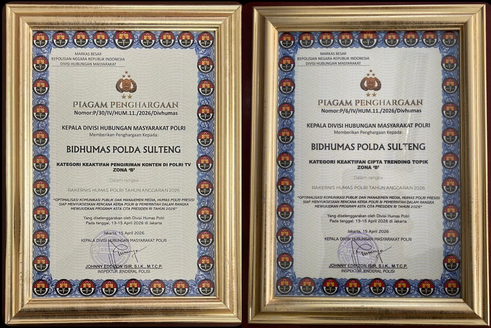 Jakarta, 21/04 (MSB) – Kepala Divisi Hubungan Masyarakat Polri, Jonny Eddizon Isir, memberikan piagam penghargaan kepada Bidang Humas Polda Sulawesi Tengah peringkat ke III atas keaktifan dalam pengiriman konten ke platform Polri TV untuk Zona “B” dan peringkat ke III keaktifan Cipta Trending Topik Zona “B”.