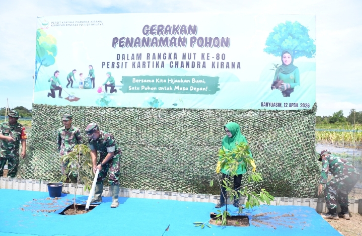Banyuasin – Swarabhayangkara.com – Dalam rangka memperingati Hari Ulang Tahun ke-80 Persit Kartika Chandra Kirana Tahun 2026, Komandan Korem 044/Gapo Brigjen TNI Khabib Mahfud, S.I.P., M.M bersama Ketua Persit KCK Koorcab Rem 044 PD II Sriwijaya melaksanakan kegiatan Gerakan Penanaman Pohon, Minggu (12/4/2026).