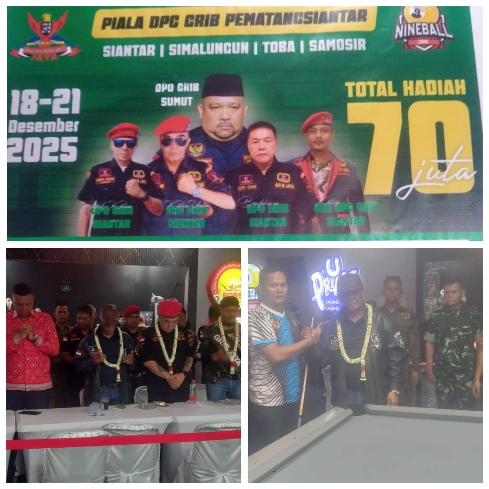 swarabhayangkara.com, Pematangsiantar – Ketua Dewan Pimpinan Cabang Gerakan Indonesia Bersatu (DPC GRIB ) Jaya kota Pematangsiantar PANGERAN HARAHAP secara resmi membuka turnamen Bilyard se kota Pematangsiantar dengan didampingi unsur Muspika kecamatan Siantar Utara, acara pembukaan, Kamis ( 18/12/2025) di NINEBALL ZONE jalan H.O.S Cokroaminoto kelurahan Melayu/Siantar Utara, pembukaan berjalan hikmat dan lancar.