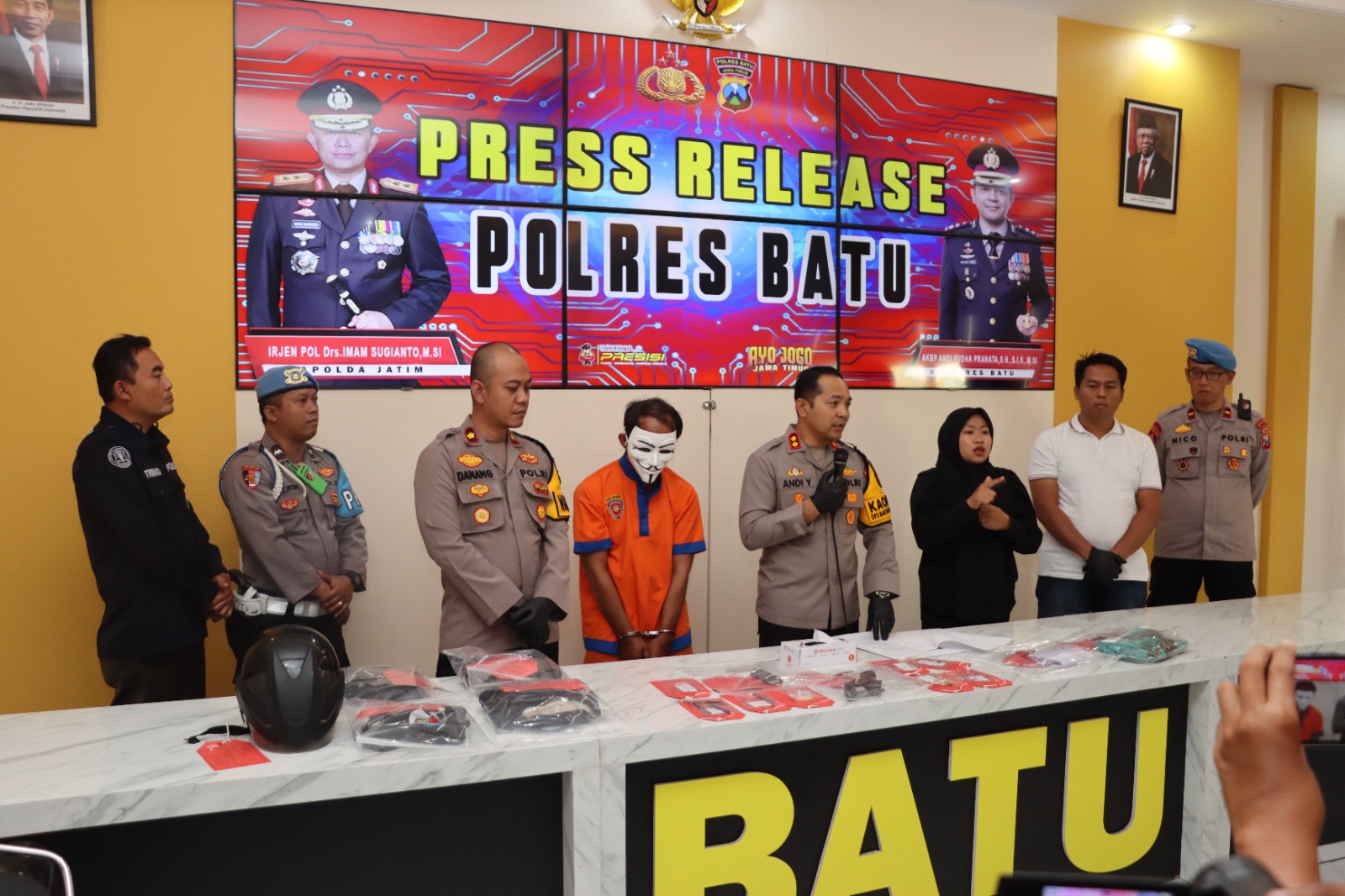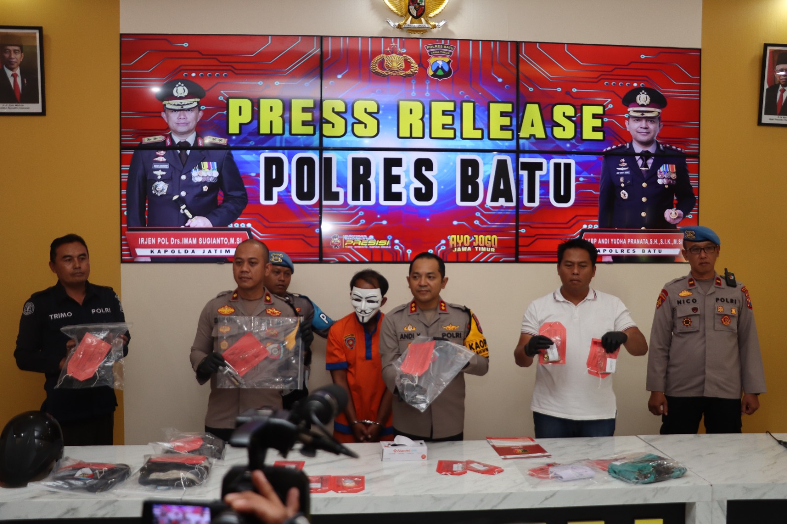 Polres Batu, swarabhayangkara.com- Kapolres Batu, AKBP Andi Yudha Pranata, S.H., S.I.K., M.Si., didampingi Wakapolres Batu Kompol Danang Yudanto, S.E., S.I.K., serta jajaran Satreskrim, Propam, dan Humas Polres Batu, menggelar konferensi pers terkait pengungkapan kasus penembakan yang melukai warga Temas, Kota Batu. Berlangsung di ruang rapat utama Polres Batu, Jum’at (11/10/2024).